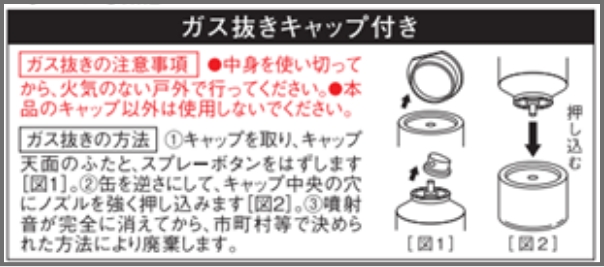 中身が残っている状態で「ガス抜きキャップ」を使うと、大量に内容物やガスがでることがあり、危険です。中身を出し切ってからキャップをご使用ください。